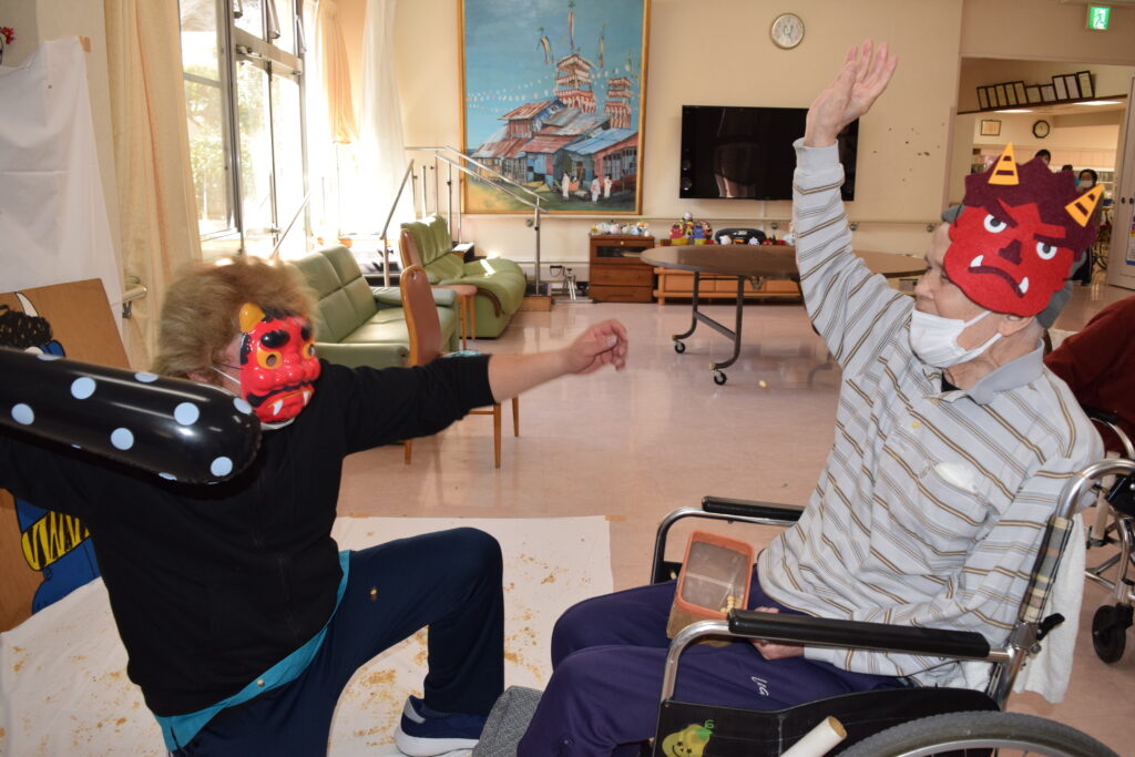 鬼に向かって豆まきをしました。鬼は外!福は内!